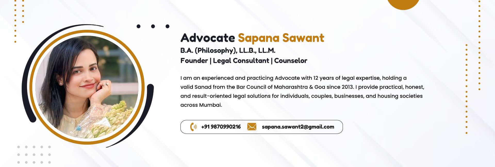 I am an experienced and practicing Advocate with 12 years of legal expertise, holding a valid Sanad from the Bar Council of Maharashtra & Goa since 2013. I provide practical, honest, and result-oriented legal solutions for individuals, couples, businesses, and housing societies across Mumbai.